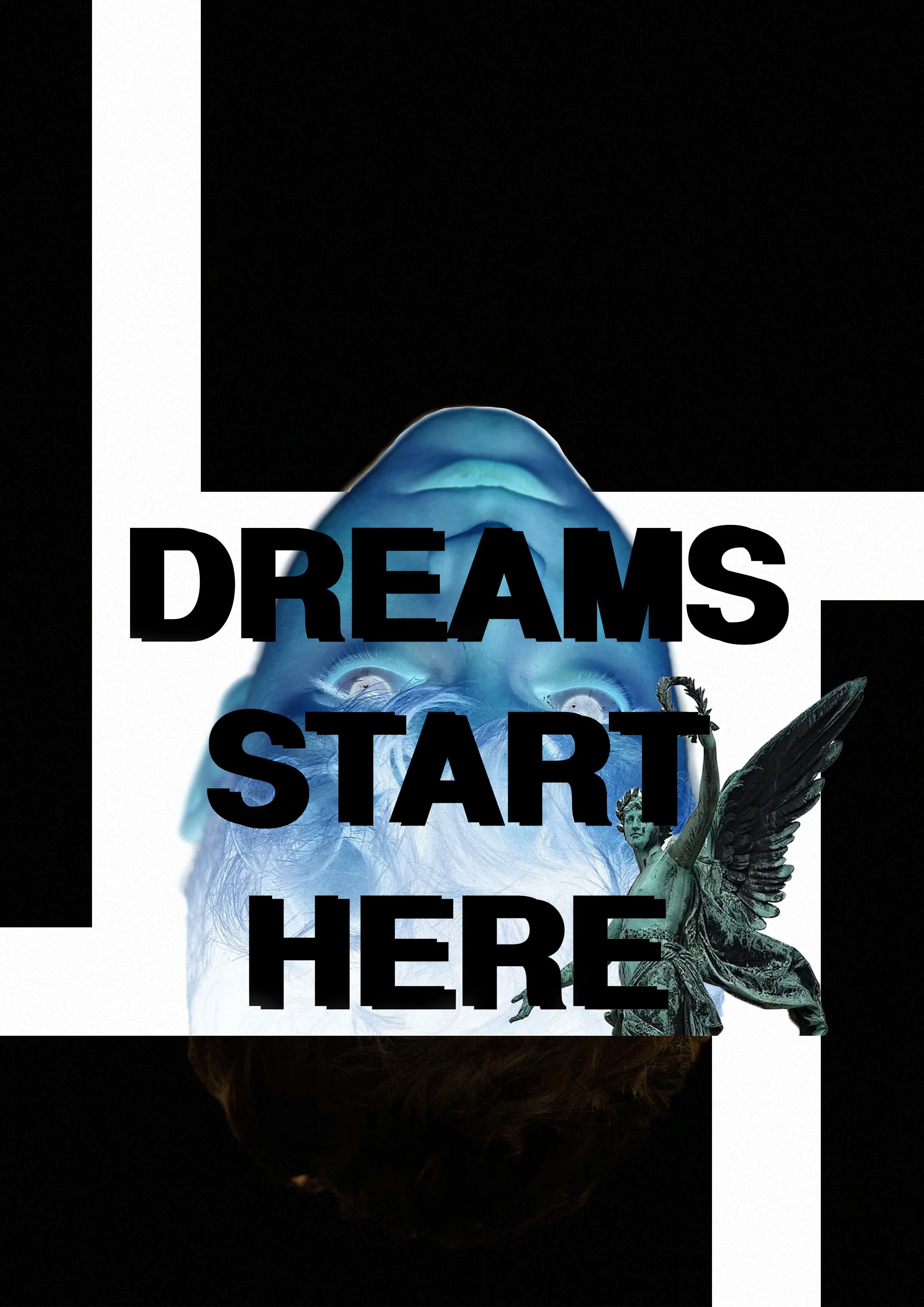 “Dreams Start Here” is a poster design which contrasts the concepts of being awake and dreaming. This is implemented through inverting the subject and positioning them at a 180degrees angle to show the process of sleep. As well as this, a green statue of a winged man is placed to suggest that this figure is not experiencing the real world. Click Image to Enlarge.