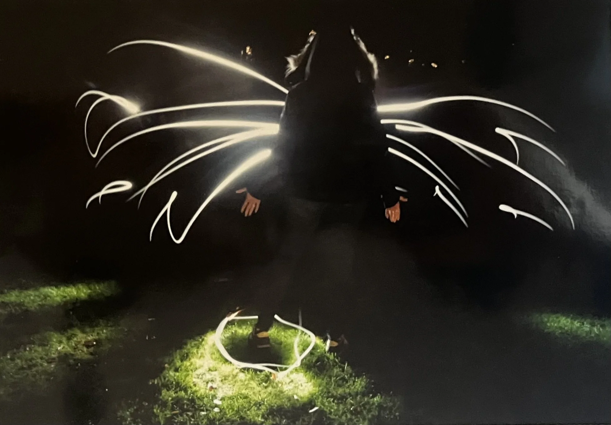 A mysterious woman wearing a hood and standing with her back to the camera, shrouded in anonymity, is captured in this captivating nighttime scene. With both hands extended, she uses the light graffiti technique from a phone torch to create ethereal wings, signifying the inclusion of imagination and creativity in this picture. The image evokes a sense of wonder and transformation. Click Image to Enlarge.