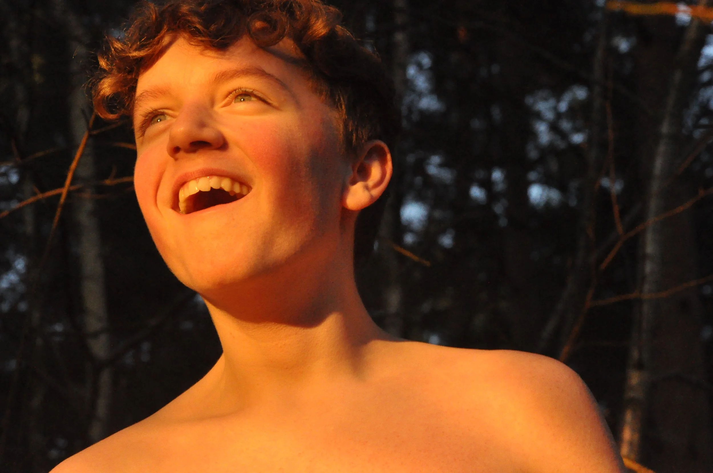 This captivating photograph captures an enchanting sunset in a forest, with a shirtless teenage boy taking centre stage. The setting sun's warm, golden rays cast a radiant glow upon his chest, illuminating his hopeful smile and creating a stunning visual effect. This image exudes a sense of optimism and connection with nature, making it a heartwarming and visually striking. Click Image to Enlarge.
