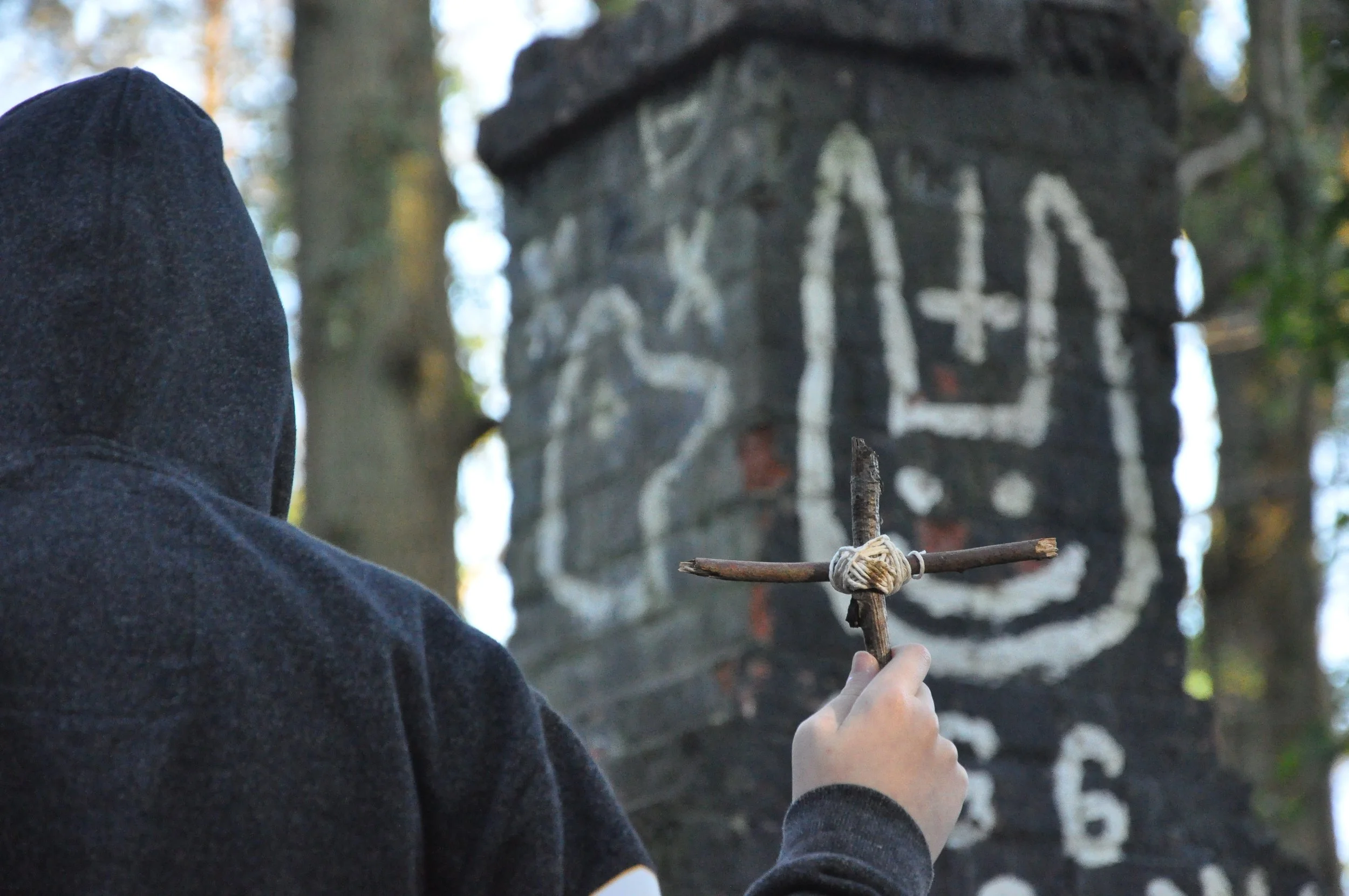 The contrast of a small, weathered brick structure adorned with unsettling demonic graffiti against a dark, foreboding backdrop creates an eerie atmosphere in this haunting photograph. The lone figure in the left corner, cloaked in anonymity and wearing a hood, turns away from the camera, adding to the mystery of the scene. The focal point, a wooden cross, stands in stark contrast to the ominous surroundings, serving as a powerful symbol of hope and contemplation, making this image a thought-provoking and captivating addition to the portfolio. Click Image to Enlarge.