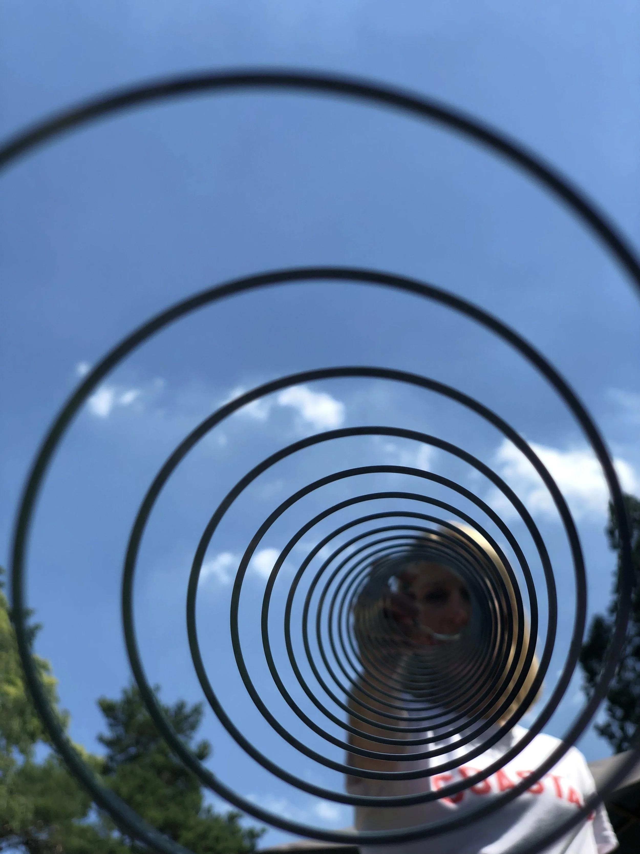 The endless blue sky creates a tranquil background in this alluring picture, luring the viewer to enjoy the wide open spaces of nature. A sliver of vivid greenery can be seen at the bottom edge, giving the composition a hint of earthy vitality. A woman in the foreground looks straight into the camera while holding a captivating spiral against her face. This dynamic connection between the woman and the viewer represents a journey of reflection. Click Image to Enlarge.