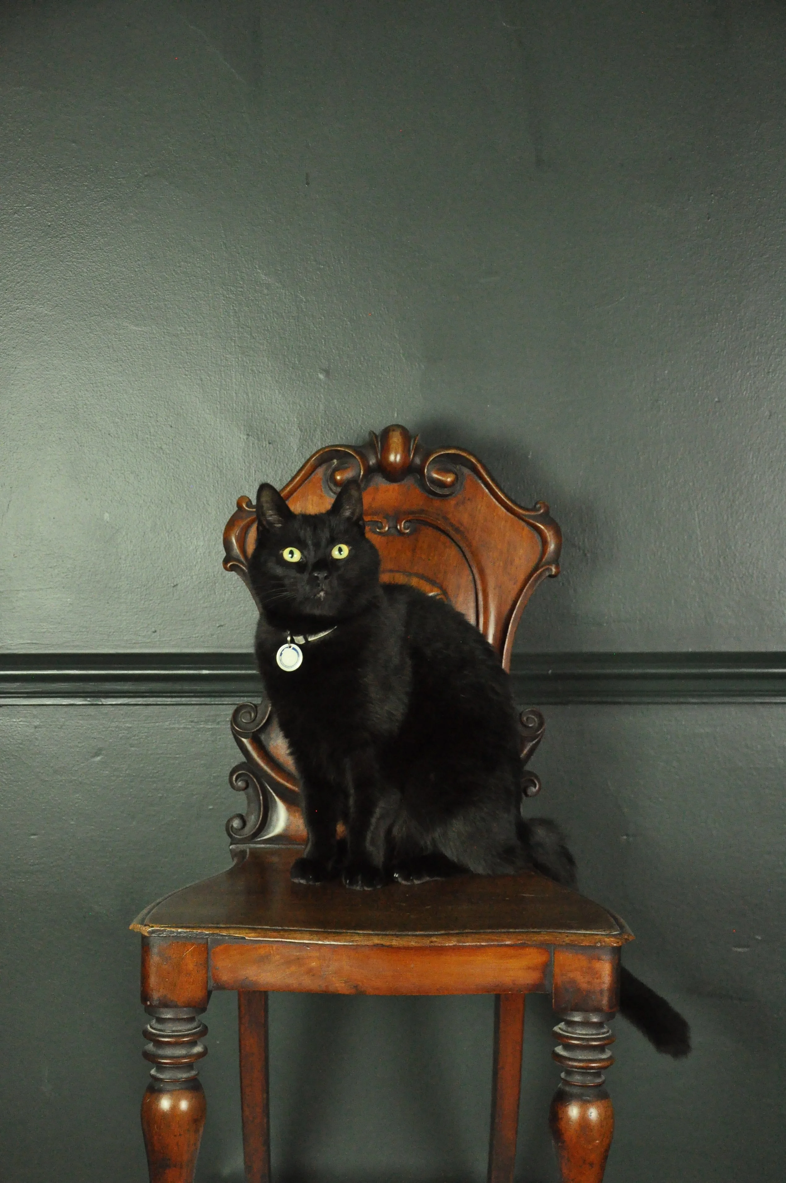 The mysterious attraction of the sleek black cat is the focal point of this picture, drawing the viewer in and capturing the mood of an atmospheric old room. The cat appears mysterious as it perches on a worn-out antique chair, its gaze fixed on something out of sight and making us feel both curious and wary. A tastefully distressed green wall serves as the scene's backdrop, lending an air of retro charm to the setting. This image leads viewers to ask themselves how the cat is sitting so still and formally on the chair due to their stereotypical unpredictable behaviour at some points. Click Image to Enlarge.