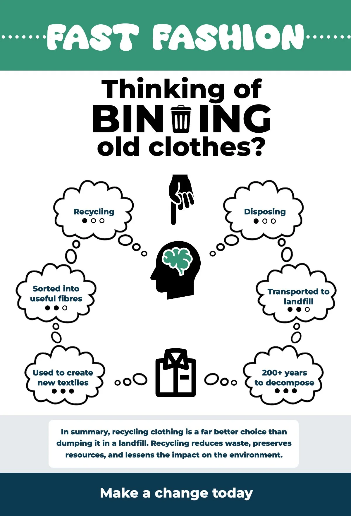 This intriguing infographic functions as a visual narrative, urging users to evaluate their garment disposal decisions. It graphically depicts two opposing paths, one promoting the sustainable road via recycling and the other illustrating the non-sustainable path concluding in a depressing landfill destination. This piece invites visitors to consider the environmental effects of their decisions with a careful combination of statistics, images, and impact-driven design. Click Image to Enlarge.