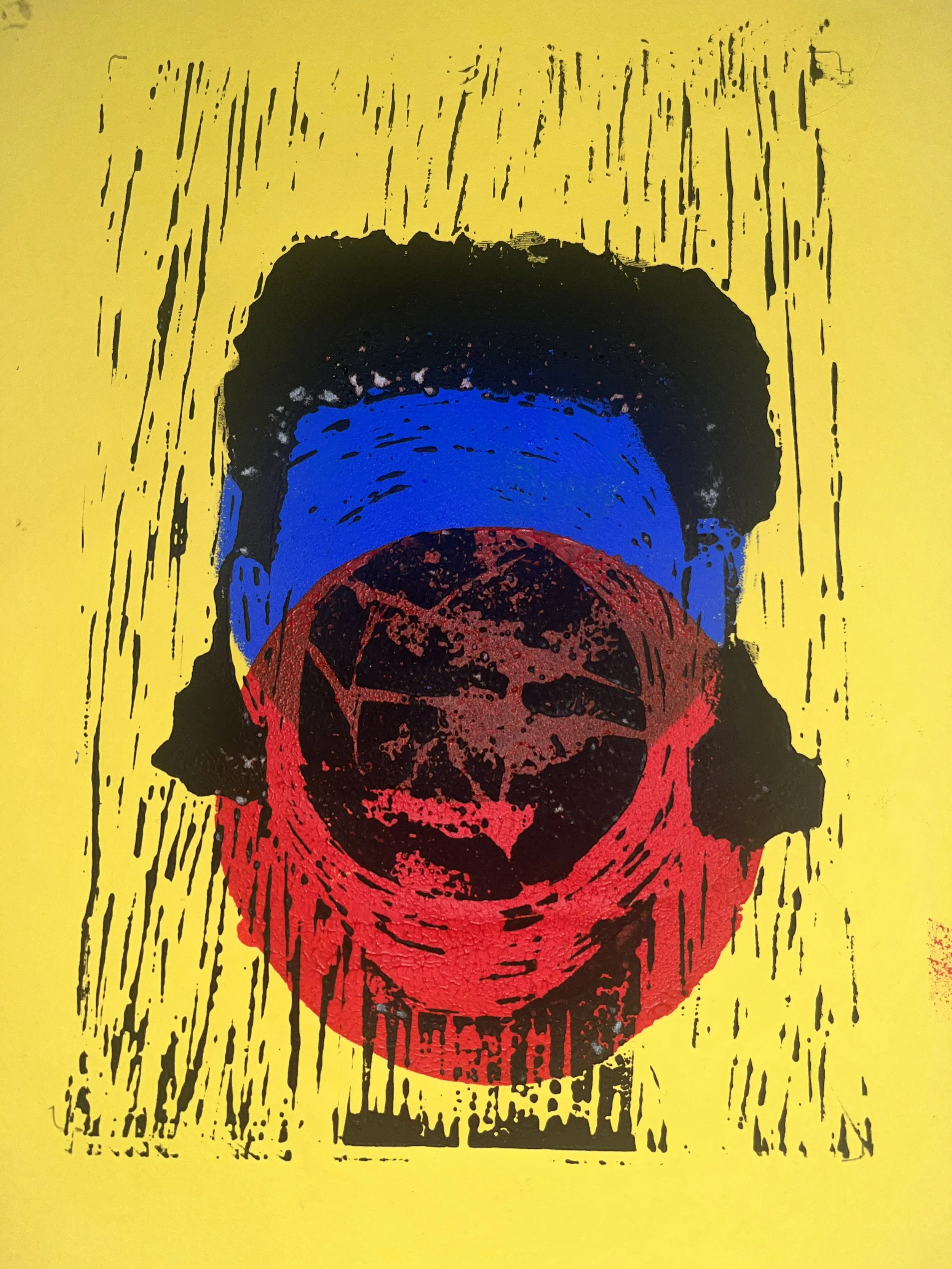 The design of this lino print is a striking visual depiction of artistic simplicity and creative symbolism. A simple yet evocative silhouette of a blue face takes the spotlight against a vivid yellow background, bringing a sense of intriguing depth to the composition. A bright red circle encompasses the spirit of the design within this face. Click Image to Enlarge.